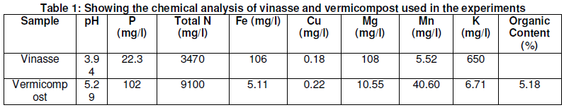 Cite this Article: Clairmont C, Bibi NA, Oudho H, Vickram P (2016). An Evaluation of ‘Vinasse’ (Bio-Ethanol Effluent) and Vermicompost as Soil Amendments for Cash Crop Production. Greener Journal of Agricultural Sciences, 6(9): 256-261, http://doi.org/10.15580/GJAS.2016.9.092816148. |