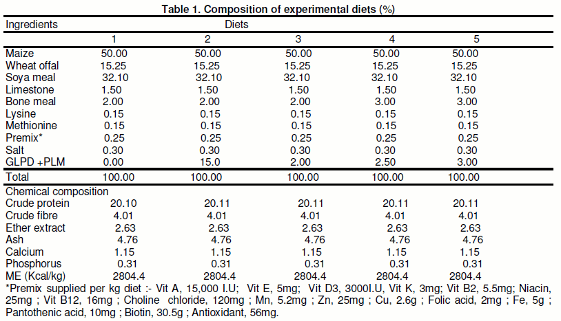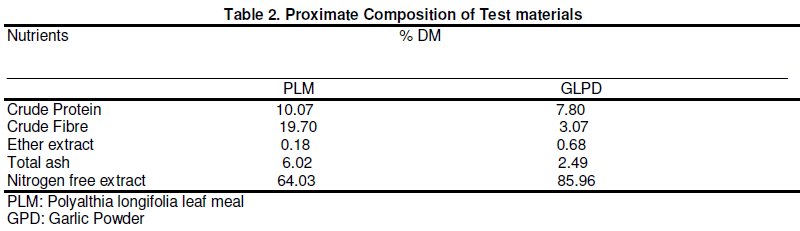 The proximate compositions of test material (PLM and GPD) are presented in Table 2. The proximate component of P. longifolia leaf meal used in this experiment are 10.07%, 19.70%, 0.18%, 6.02% and 64.03% for crude protein, crude fiber, ether extract, ash and nitrogen free extract respectively while those of Garlic powder are 7.08%, 3.07%, 0.68%, 2.49% and 85.96% for crude protein, crude fiber, ether extract, ash and nitrogen free extract respectively. The proximate content shows that PLM had a higher crude protein, crude fiber and ash than GLPD. However, the proximate analyses of PLM are comparable with the earlier findings of Ojewuyi et al (2014). They showed that crude protein, crude fiber, crude lipid, total ash and moisture contents in PLM sample were 10.05±1.14, 18.50±0.05, 0.26±0.05, 5.05±0.05 and 8.70±0.50 respectively while those of Garlic powder (GPD) agrees with the reports of Otunola et al (2010) and Nwinuka et al (2005).
