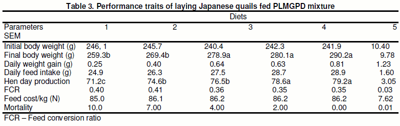 The performance traits as influenced by the diets are presented on Table 3. The quail’s final live weight ranges between 259.3g and 290.2g. The daily feed intake values obtained are 24.9, 26.3, 27.5, 28.7 and 28.9g for diets 1, 2, 3, 4 and 5 respectively while those of hen day production are 71.2, 74.6, 76.5, 78.6 and 79.2% for diets 1, 2, 3, 4 and 5 respectively. The final live weight and the hen day production were significantly affected (P<0.05) by the dietary inclusion of PLMGPD mixture, the daily feed intake increases slightly as the level of PLMGPD increased though not at a significant level. The feed conversion ratio values obtained are 0.40, 0.41, 0.36, 0.35 and 0.35 for diets 1, 2, 3, 4 and 5 respectively while feed cost /kg (N) values are 85.0, 85.8, 85.9, 86.0 and 86.1 for diets 1, 2, 3, 4 and 5 respectively.