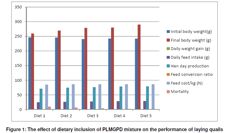 Feed intake increased with increasing level of PLMGPD but was not statistically significant. This report agrees with the findings Raeesi et al (2012) on the periodic use of Garlic powder on broilers and contrary to the reports of Eid and Iraqi (2014). Quails fed diet 1 had the highest mortality of 10, followed by diet 2 with 7 quails, no mortality was recorded for quails fed diet 5, and this is contrary to the reports of Safa M A El Tazi (2012). Hen day production showed that laying quails on diet 5 performed better than those on diet 4, 3, 2 and 1 respectively, this observation agreed with the views of Odunsi et al (2007) and contrary to the reports of Khan et al (2007) on effects of dietary garlic on the performance and egg yolk cholesterol in laying hens.