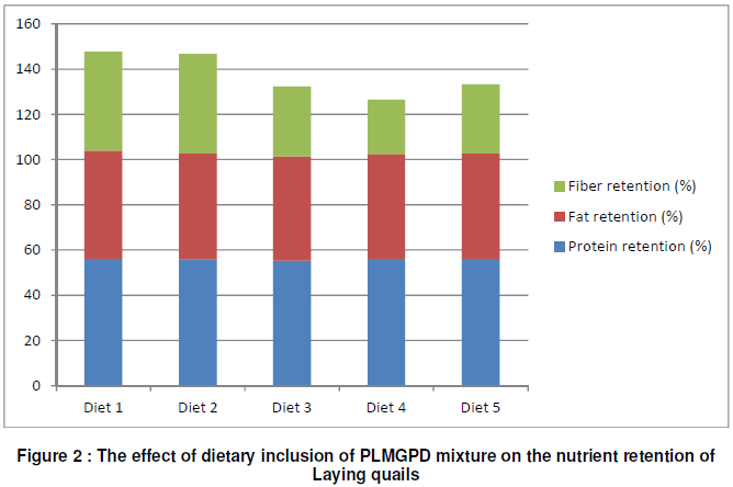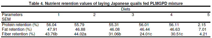 Table 4 shows the nutrient retention values of laying Japanese quails fed PLMGPD mixture. Protein retention values obtained are 56.04, 55.79, 55.31, 56.01 and 56.11% for diets 1, 2, 3, 4 and 5 respectively while fat retention values are 47.91, 46.88, 46.08, 46.44 and 46.63% for diets 1, 2, 3, 4 and 5 respectively. Fiber retention values are 43.76, 44.02, 31.06, 24.01 and 30.51% for diets 1, 2, 3, 4 and 5 respectively. Protein retention values increased from diet 1 to 2 after which the value declined, fiber retention values were significantly (P<0.05) influenced by the different inclusion levels of PLMGPD mixture.