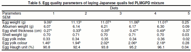 The egg quality parameters as influenced by the diets are presented on Table 5. The egg weight values obtained are 9.06, 11.3, 11.07, 11.06, 11.01g for diets 1, 2, 3, 4 and 5 respectively while those of Albumen weight are 6.07, 6.14, 6.21, 6.17 and 6.30 g for diets 1, 2, 3, 4 and 5. The values obtained for egg shell thickness are 0.27, 0.33, 0.35, 0.47 and 0.49 mm for diets 1, 2, 3, 4 and 5 respectively while shell weight values are 0.70, 0.71, 0.70, 0.71 and 0.70. The values of the egg weight and egg shell thickness marginally increased from diet 1 to 5 and were significantly (P<0.05) influenced by the different inclusion of PLM + GPD mixture. The values obtained for egg yolk index are 0.33, 0.34, 0.35, 0.34 and 0.36 for diets 1, 2, 3, 4 and 5 respectively while those of egg yolk colour are 1.46, 1.94, 2.02, 2.06 and 2.18 for diets 1, 2, 3, 4 and 5 respectively. Egg Haugh unit values obtained are 90.8, 92.4, 93.8, 95.2 and 96.1 for diets 1, 2, 3, 4 and 5 respectively. Egg yolk colour were significantly (P<0.05) different among the dietary treatments, egg yolk index and egg haugh unit were not significantly (P>0.05) affected.