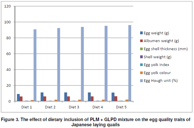 Egg weight, egg shell thickness and yolk colour values showed that there were significantly (P<0.05) different this could be due to high minerals and vitamins in the test ingredients. According to Ojewuyi et al (2014) PLM is rich in calcium (89.18±3.20mg), potassium (23.55±0.17mg), sodium (30.03 ± 2.20mg) and magnesium (27.55±1.10mg) while GPD contains calcium (19.83 ± 0.83mg), phosphorus (9.54 ±0.34mg), iron (4.21 ± 0.15mg), sodium (4.10 ± 0.18mg), magnesium (3.94 ± 0.13mg), zinc (0.34±0.01mg), manganese (0.016 ± 0.00mg), copper (0.012 ± 0.00mg) and potassium (54.65 ± 1.74mg) Marina et al (2014).