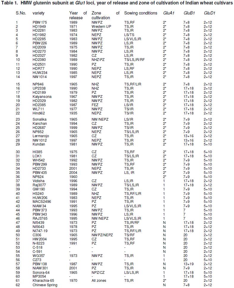 In this study, the electrophoretic patterns of HMW glutenin subunits were analysed from 62 spring wheat cultivars released between 1965 and 2001. These cultivars were developed for five wheat agroclimatic zones of India, viz, North Western Plains Zone (NWPZ), Northern Hills Zone (NHZ), North Eastern Plains Zone (NEPZ), Central Zone (CZ) and Peninsular Zone (PZ) (Table1).