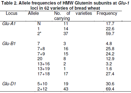 Amongst the 62 varieties analysed for high molecular weight glutenin subunits, three alleles and their corresponding subunits Glu-A1a (1), Glu-B1b (2*) and Glu-A1c (Null) with 16.1, 24.2 and 59.7% frequency were observed. Allelic variation at Glu-B1 locus showed seven alleles which included Glu-B1a (7), Glu-B1b (7+8), Glu-B1c (7+9), Glu-B1e (20), Glu-B1f (13+16), Glu-B1g (13+19) and Glu-B1i (17+18) 4.8, 25.8, 24.2, 12.9, 3.2, 1.6 and 27.4%, respectively. The Glu-D1 locus showed two alleles with their subunits included Glu-D1a (2+12) and Glu-B1d (5+10) with frequency of 69.4 and 30.6%. A total of 12 different alleles were identified on all three Glu1 loci (Table 2).