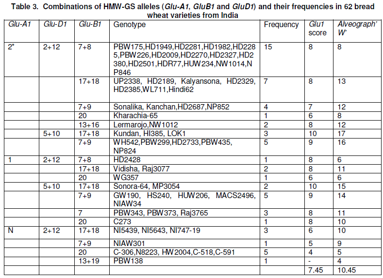 The maximum frequency of subunit 2* and 1 at Glu-A1 locus indicated that varieties were improved for higher gluten strength compared to null allele in lowest frequency. The GluA1c (null) allele was found to exist only in combination with Glu-D1a (2+12) in analysed varieties.