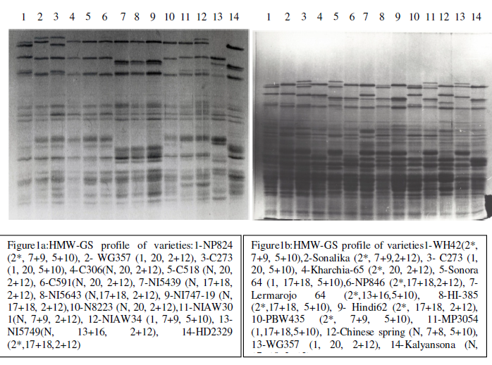 Plant material: Seeds of 62 bread wheat varieties (Table 1) collected from different research and development institutions in India and maintained at Gamma field, Bhabha Atomic Research Center, Mumbai were used for this study. The grains were ground to fine powder and 10mg was weighted in 1.5mL micro tube. 250l of protein extraction buffer (Tris-Hcl 0.05M, pH.8, 0.02% SDS, 30.3% urea, 1% 2-mercaptoetnanol) was added to each micro tube, boiled on flame for 10 minutes, and then after cooling centrifuged at 13000rpm for 10 min. The high molecular weight glutenin subunit profile of wheat varieties was resolved by sodium dodecyl sulfate polyacrylimide gel electrophoresis (SDS-PAGE) procedure according to Laemmlii (1970) and latter modified by Bhagwat and Bhatia (1993). The high molecular weight glutenin subunit variation was identified using the numbering system of Payne and Lawrence (1983). The quality scores was assigned to each HMWGS of a subunit pair using scoring described by Payne et al. (1987) and Pogna and Mellini (1986).