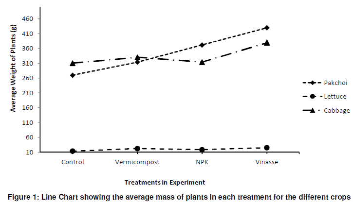 For cabbage, the data show that the vinasse treated plants produced the highest average mean mass of 379.36g, followed by vermicompost at 330.79g, NPK at 314.43g and the control at 310.85g. Statistical analysis indicated that there was no significant difference (p<0.05) in the mean mass amongst the various treatments. Cabbage requires large amounts of nitrogen, phosphorous and potassium during head formation and also has high sulphur and calcium demands. Cabbage also benefits from high organic matter content of soils and is very sensitive to boron and magnesium deficiencies (Pestizid Aktions-Netzwerk, 2015). These properties would make vinasse the most suitable soil amendment for cabbage.