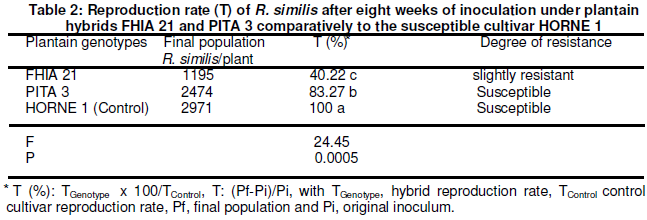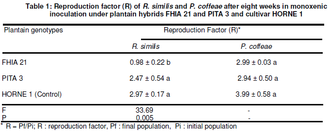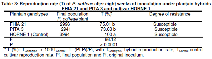 Host suitability of FHIA 21 and PITA 3 to R. similis et P. coffeae