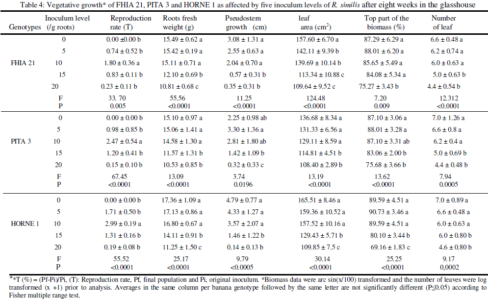 Incidence of R. similis and P. coffeae on vegetative parameters of plantain hybrids FHIA 21 and PITA 3