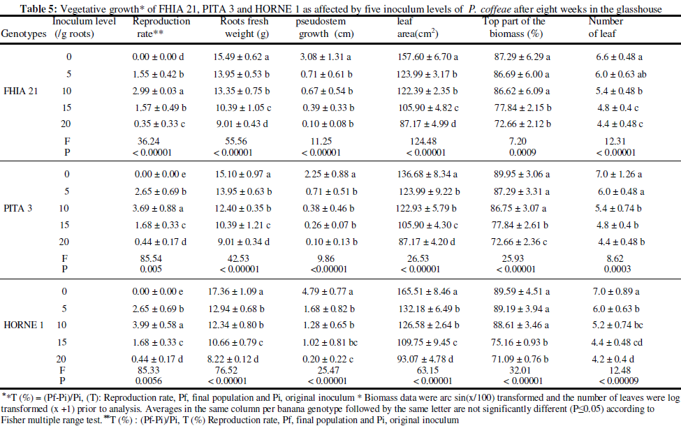 Increasing inoculum levels of nematodes (0, 5, 10, 15 and 20 nematodes/g roots) was negatively correlated to the measured agronomic parameters (fresh weight of roots, stem growth, leaf area, biomass and leaf number). With R. similis, the incidence of nematode infection was generally recorded under the initial density of 10 nematodes/g fresh roots on FHIA 21 and PITA 3 (Table 4). As for P. coffeae, significant incidence of the nematode on all three plantain genotypes was noted from the initial density of 5 nematodes/g roots (Table 5). The result reported here with the initial density of 10 R. similis per gram of roots confirms the damage threshold set by Guérout (1972). That threshold has served as reference for the implementation of the warning strategy used in the framework of rational nematicide applications in commercial banana orchards in Côte d’Ivoire; strategy based upon the evolution of the nematode infestation in the field, especially that of the most damaging and predominante species Musa spp. in the country, R. similis (Sarah, 1989; Adiko and N' guessan , 2001). With P. coffeae on the contrary, the damage threshold was noted at 5 nematodes/g roots. All the vegetative parameters measured were significant at that inoculum level on the three plantain genotypes (Table 5). This variation in the incidence of two migratory endoparasitic nematodes may be due, in part, to the differential aggressiveness between the two species. Indeed, the greater damage capacity of P. coffeae can be related to the parasite ability to colonize all cellular compartments of the root system (Araya and De Waele, 2004). Furthermore, because of the amphimictic and parthenogenetic reproduction of P. coffeae, both male and female nematodes in the population attack the plant in addition to four juvenile stages (J1 to J4) that are also infectious (Pinochet and al., 1995). Moreover, the biological life cycle of P. coffeae (21 days) compared with that of R. similis (28 days) is shorter and the former species, more prolific. As for R. similis that has a parthenogenetic reproduction, males are rare, and only female and three juvenile stages (J1 to J3) are infectious (Stoffelen and al., 1999). All these factors could account for the damage threshold of 5 nematodes/g roots against 10 nematodes/g roots for R. similis reported. In Côte d’ivoire, Gnonhouri and al. (2009) showed that since the evolution of nematofauna associated with Cavendish banana cultivation and characterized by the prevalence of P. coffeae, banana orchards are subject to frequent replanting.