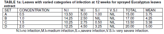 The mean data of sprayed Eucalyptus leaves extract plants at different concentrations ranged from 3.37-5.0 and 3.12-4.75 for Xylopia aethiopia leaves extract sprayed plants showed that there is a significant difference as shown below.