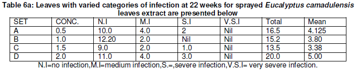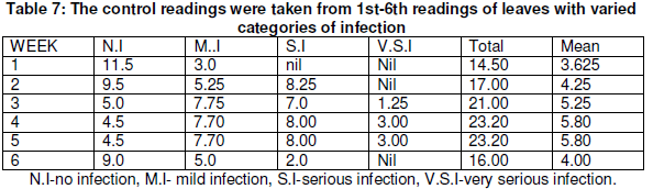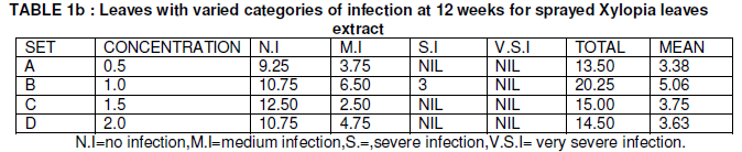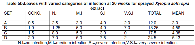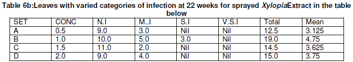 2. There is no significant difference between leaves of the varied categories of infection for sprayed Eucalyptus and Xylopia aethiopia leaves extract except for table 5,6 and the control.
