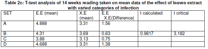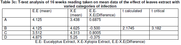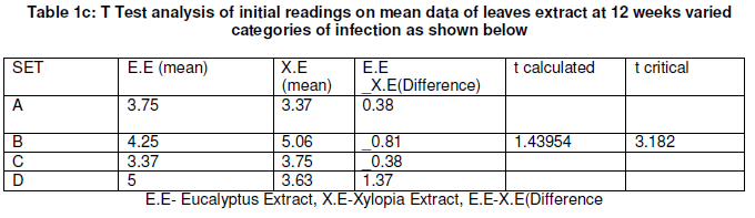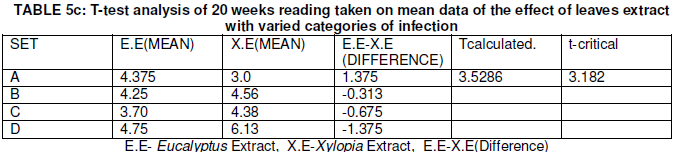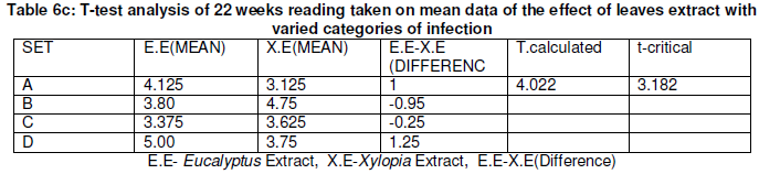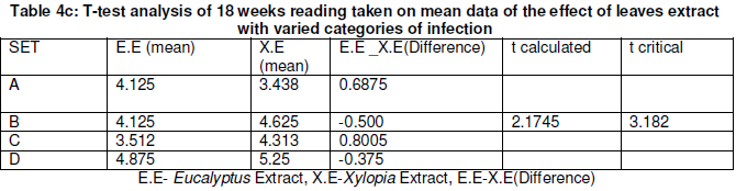 There is no significant difference between the means of data obtained because t critical is greater than t calculated. From table 1a and 1b, the mean data of sprayed Eucalyptus leaves extracts plants at different concentration ranged from 3.87-4.87 and 3.69-3.13 for Xylopia leaves extract sprayed plants. A t-test analysis (Table 1c) conducted on mean data of sprayed Eucalyptus leaves extracts plants and sprayed Xylopia extract plants showed that there were no significant difference.
