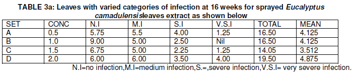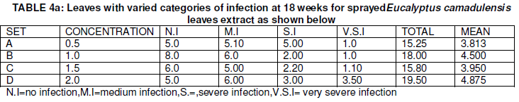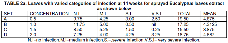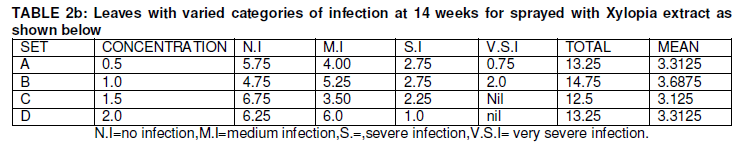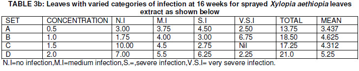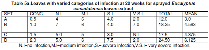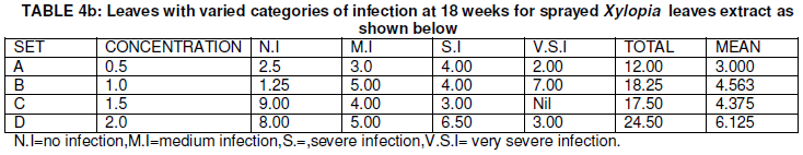 From Table 2a and 2b, the mean data of sprayed Eucalyptus camadulensis leaves extract plants andXylopia aethiopia leaves extract plants at different concentrations ranged from 3.51-4.87 and 5.25-3.44 for Xylopia aethiopia extract sprayed plants showed that there were no significant difference.
