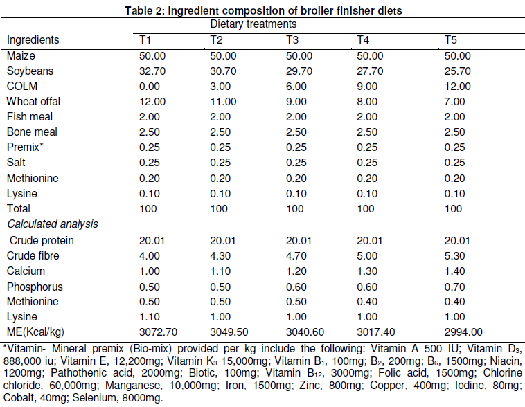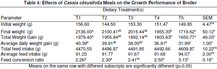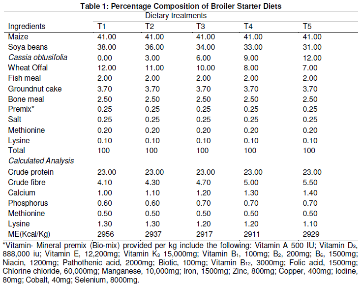 The diets were formulated such that Cassia obtusifolia leaves were used at 0%, 3%, 6%, 9% and 12% to represent treatments T1, T2, T3, T4 and T5 respectively as shown in Tables1 and 2 for both starter and finisher diets. Two hundred (200) unsexed day old Marshall broiler chicks procured from Otta Farms Ltd, Ibadan, Oyo State, Nigeria. They were brooded for one week on commercial starter diet, and were randomly allocated to five dietary treatments of four replicates with ten birds per replicate in completely randomised designed. The birds were managed on a deep litter system throughout the experimental period. Routine management practices were observed as recommended by Oluyemi and Robert,(2000). The experiment lasted for 8 weeks.