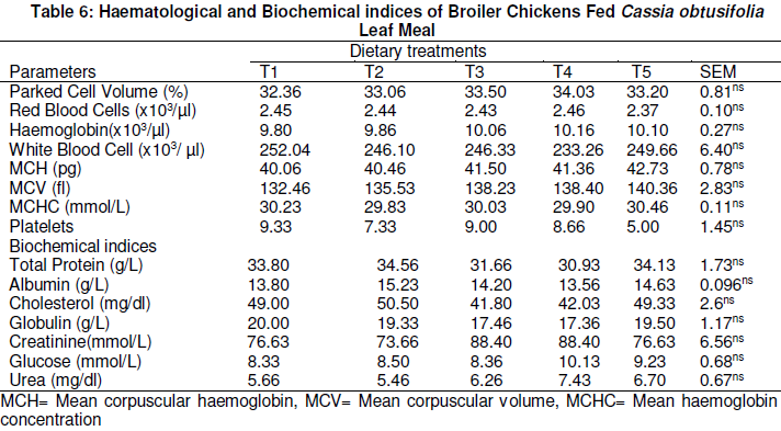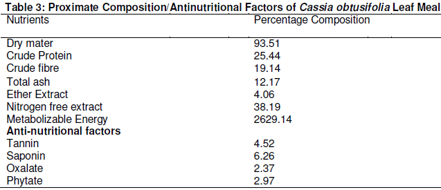 The result of the proximate composition of Cassia obtusifolia leaf meal is presented in Table 3.The result shows that it contains 93.51% dry matter, 25.44% crude protein, 19.14%,crude fibre and 38.19% nitrogen free extract. The leaf meal also contains saponin (6.26%) phytate (2.97%), tannins (4.52%) and oxalates (2.37%). The crude protein value was similar to 25.37% reported by Abu et al. (2015) but higher than 21.10% reported by Adjoudji et al. (2005). The value however was lower than 27.40% reported by Ayssiwede et al. (2012). Crude fibre value was similar to the 19.25% reported by Odura et al. (2008).The metabolizable energy was higher than 2050 Kcal/kg reported by Ayssiwede et al. (2012). Tannin content recorded was similar to 4.06% reported Nuhu et al. (2010). However, the phytate value obtained was lower than 13.52% recorded by Nuhu et al. (2010). Studies have attributed variations in nutrient composition and anti-nutritive factors of leaf meals to the age of leaves at harvesting, climatic conditions, edaphic factors as well as methods of processing and laboratory analysis (Taiwo et al., 2005).