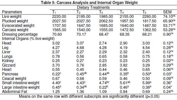 The values of live weight, plucked weight, eviscerated weight, carcass weight and dressing percentage were not significantly (p>0.05) different across the treatment groups. The result agreed with the findings of Ayssiwede et al. (2012), who observed no significant difference in carcass characteristics when they fed Cassia obtusifolia leaf meal to broiler chickens.