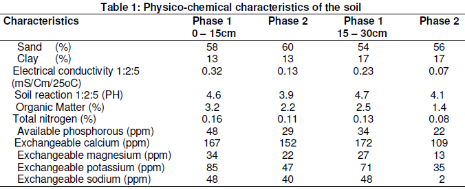 The physio-chemical characteristics of the soil of the experimental plots are presented Table 1. The soils are sandy loam in texture, very acidic and have a good content of organic matter. The electrical conductivity of the soil, at both depths, in the first phase were higher than the conductivity in the second phase of the study . The soil in the first phase of the study was also more acidic, contained more organic matter, more silt, and more exchangeable minerals than the soil at the second phase of the study.