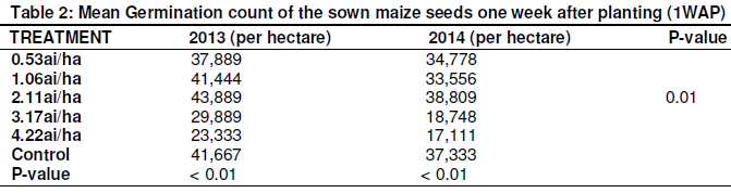 The mean germination counts of the maize seeds sown in the experimental plots one week after planting are shown in Table 2. The mean germination counts in treated in first phase of 35, 288.8 plants/hectare is significantly higher than the count of 28,600.4 plants/hectare in the second phase of the study (p-value < 0.01). In each phase of the study, the germination count in the treated plots were comparable to the control, up to the manufacturer recommended dose (2.11ai/ha); and then significantly decreased in the plots in which the herbicides were applied at above the manufacturer recommended dose. The results showed that the application of different concentrations of the herbicides had statistically significant effects on the germination count of the sown maize seeds (p-value < 0.01).