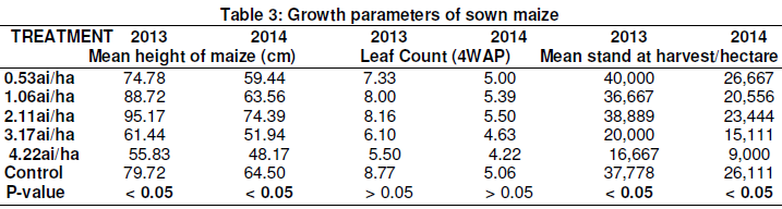 Materials and methods: The study was carried out in a plot of land at the University of Port-Harcourt in 2013 and 2014, using a randomized complete block design with three replicates, and plot size of 2m x 2m. Glyphosate was used to prepare the experimental plots, while different application doses of primextra dual gold (atrazine and metolachlor) were applied to the plots, after planting the maize. The control plot was not treated with the herbicides. The growth and yield parameters of the maize planted in the plots were assessed through the physio-chemical characteristics of the soil, the germination count, leaf count, height of maize plant, and the yield of maize at harvest.