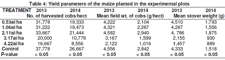 Like the growth parameters, the yield parameters of the maize sown in the plots in which the herbicides had been applied at or below the manufacturer’s recommended dose (2.11ai/ha) were comparable to those of the control; and then significantly decreased in the plots in which the herbicides were applied in overdose.