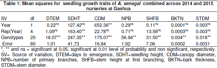 The analysis for days to emergence seedling height, canopy diameter, number of primary branches, stem height at first branching, bark thickness and stem diameter combined across 2014 and 2015 at Gashua are presented in Table 1. The mean squares due to genotypes were highly significant (P<0.01) for all traits, indicating that the genotypes under study are highly variable.