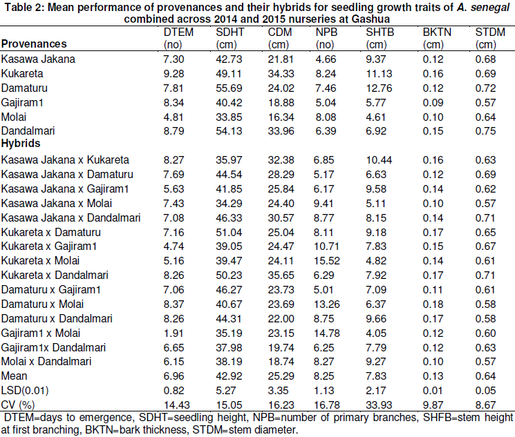 The mean performance of provenances and their hybrids for seedlings growth traits combined across 2014 and 2015 are presented in Table 2. Molai provenance had the shortest days to emergence. Damaturu and Dandalmari though statistically comparable had tallest seedlings compared to the rest of the provenances. Kukareta and Dandalmari recorded the widest canopy diameter. Kukareta and Molai though statistically similar gave the highest number of primary branches compared to Kasawa Jakana and Gajiram1. The tallest stem height at first branching was recorded for Damaturu and Kukareta. For the trait bark thickness Kukareta and Dandalmari were the thickest. Provenances Dandalmari, Damaturu, Kukareta and Kasawa Jakana though statistically comparable had significantly wider stem diameter than Gajiram1 and Molai that appear weak in their performance with respect to most of the traits studied. The hybrids Gajiram1 x Molai, Kukareta x Gajiram1, Kukareta x Molai, Kasawa Jakana x Gajiram1 and Molai x Dandalmari recorded the lowest number of days to emerge while the rest of the hybrids took seven days or more before emergence. Hybrids Kukareta x Damaturu and Kukareta x Dandalmari though statistically similar recorded the tallest seedlings compared to the rest of the provenances which were statistically comparable. Kukareta x Dandalmari showed the widest canopy diameter while the rest of the hybrid had similar canopy sizes. Statistically higher numbers of primary branches were recorded for Kukareta x Molai, Gajiram1 x Molai, Damaturu x Molai and Kukareta x Gajiram1 compared to the rest of the hybrids. Kasawa Jakana x Kukareta though statistically comparable with most of the hybrids resulted in taller stems at first branching compared to Gajiram1 x Molai and Kasawa Jakana x Molai that recorded the shortest stems. Hybrids Damaturu x Molai, Kukareta x Damaturu, Kukareta x Dandalmari, Damaturu x Dandalmari and Kasawa Jakana x Kukareta had thicker barks compared to the rest of the hybrids that were statistically similar. Kasawa Jakana x Dandalmari and Kukareta x Dandalmari showed the highest mean values for stem diameter while Kasawa Jakana x Molai, Damaturu x Molai and Molai x Dandalmari recorded the lowest mean values compared to the rest of the hybrids that had similar stem sizes.