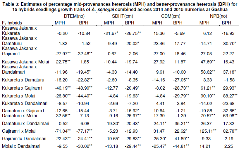 The estimates of percentage heterosis for 15 F1 hybrids over mid- and better-provenances for seedling growth traits combined across 2014 and 2015 nurseries at Gashua are presented in Table 3.