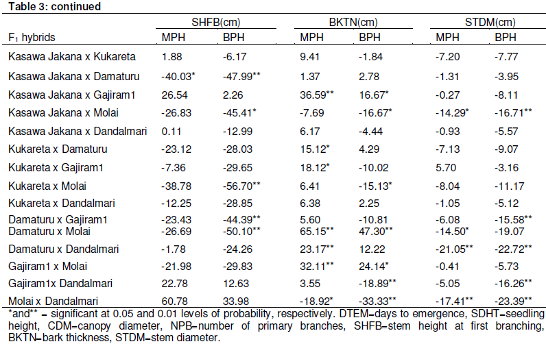 Stem height at first branching: Among the 15 hybrids, one hybrid each recorded significant positive and significant negative mid-provenance heterosis for the trait (Table 3). Molai x Dandalmari (60.78%) showed positive value while Kasawa Jakana x Damaturu (-40.03%) showed negative value. Better- provenance heterosis occurrence in the 15 hybrids revealed three were positive, none was significant and twelve were negative of which five were significant (Table 3). Kasawa Jakana x Damaturu, Kasawa Jakana x Molai, Kukareta x Molai, Damaturu x Gajiram1 and Damaturu x Molai recorded significant negative better- provenance heterosis for the trait.
