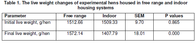 The experimental hens did not change their body weights and kept their live weights in the standards of their belonging breed body weight standards. However, according to Table 1, indoor hens lost much live weight than free range ones (P˂0.01).