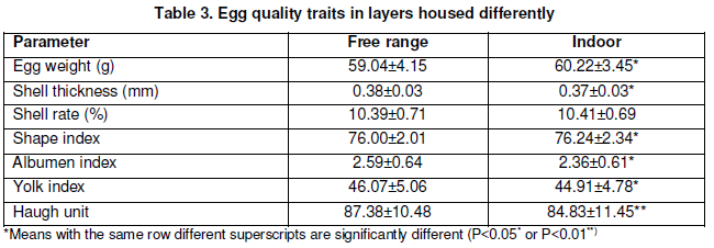 Indoor hens produced heavier eggs compared to free range hens (P˂0.05). Both free range and indoor hens produced eggs in the range of standards, in average 57.6 g according to the study of Sarıca and Erensayın (2009).
