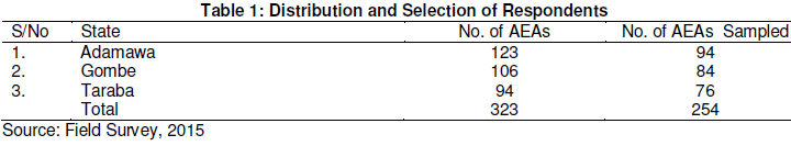 Stage II: All the agricultural extension agents in the three states were eligible to be included in the sample for study. A list was obtained from the headquarters of the various state ADPs. In all, a total of 323 agricultural extension agents from the three states served as the sample frame (Table 1).