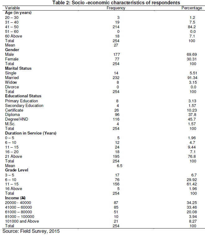 The socio-economic characteristics of respondents studied include, age, gender, marital status, educational status and duration in service. Estimated income and grade level of the respondents was also considered (Table 2).