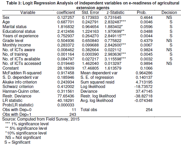 Logit regression analysis was used to determine the extent to which each of the independent variables has contributed in explaining the variance in the e-readiness of agricultural extension agent. The regression equation is represented as: