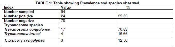 The overall infection rate was 25.53% and the trypanosome species observed were Trypanosoma congolense (70.83%), T. brucei (16.66%) and mixed infections of T. brucei and T. congolense (12.5%). The average packed cell volume (PCV) of infected animals (26.62) appeared higher than the average PCV of non infected (26.40). This was however statistically insignificant ( p>0.05).