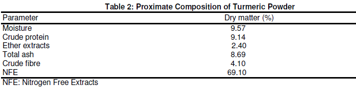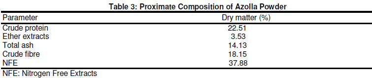 The proximate composition of turmeric is shown in Table 2. The proximate components of turmeric are 9.57%, 9.14%, 2.40%, 8.69%, 4.10% and 69.10% for moisture, crude protein, ether extract, ash, crude fibre and nitrogen free extract, the results obtained agrees with the findings of Ikepeama et al (2014) and Alagbe, J.O (2016) on the chemical composition of turmeric. Table 3 reveals the proximate composition of Azolla powder, the proximate content of Azolla contains 22.51%, 18.15%, 3.53%, 37.88% and 14.13% for crude protein, crude fibre, ether extract, nitrogen free extract and total ash. The values recorded in this study were within the range reported by Alalade and Iyayi (2006); Alagbe, J.O (2017).