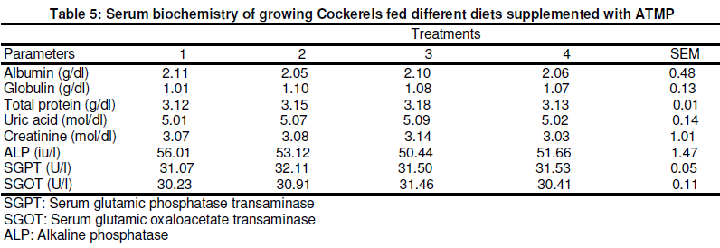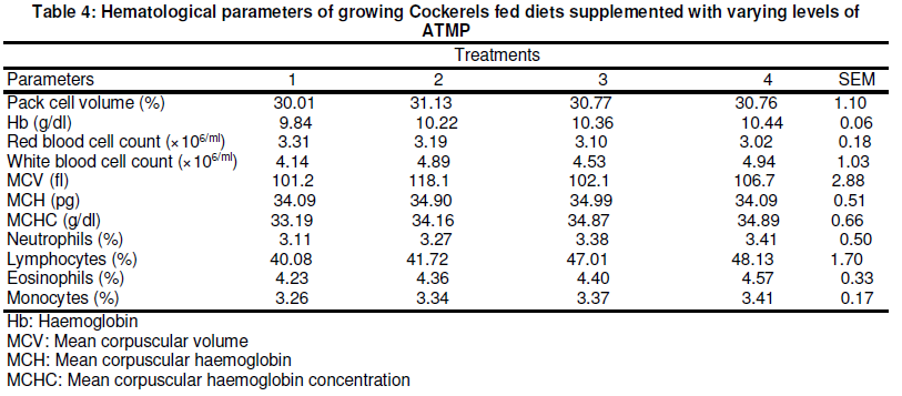 Table 4 shows the Hematological parameters of growing Cockerels fed diets supplemented with varying levels of ATMP. Pack cell volume (PCV) values obtained are 30.01%, 31.13%, 30.77% and 30.76% for treatments 1, 2, 3 and 4 respectively while those of Haemoglobin (Hb) are 9.84, 10.22 ,10.36 and 10.44 (g/dl) for treatments 1, 2, 3 and 4. The values obtained for Red blood cell (RBC) are 3.31, 3.19, 3.10 and 3.02 (×106/ml) for treatments 1, 2, 3 and 4 respectively while those of MCV are 101.2, 118.1, 102.1 and 106.7 (fl) for treatment 1, 2, 3 and 4 respectively. MCH values obtained are 34.09, 34.90, 34.99 and 34.09 (pg) for treatments 1, 2, 3 and 4 respectively while those of MCHC are 33.19, 34.16, 34.87 and 34.89 (g/dl) for treatments 1, 2, 3 and 4. Pack cell volume (PC V ) , Heamoglobin (Hb), red blood cell (RBC), mean corpuscular volume (MCV), mean corpuscular haemoglobin (MCH) and mean corpuscular haemoglobin concentration (MCHC) were not significantly (P>0.05) different among the dietary treatments. However, all values fall within the range reported by Talebi et al (2005); Kececi and Col (2011); Wiki vet (2013) and Abdi-Hachesoo et al (2011) of chicken. According to Togun et al (2007) physiological and nutritional status of animals could cause differences in haematological parameters.