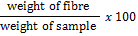 After acid hydrolysis, the content of the beaker was filtered under vacuum through a Buchner funnel fitted with filter paper and washed with boiling water until the washing was no longer acidic to litmus. The residue was washed into the original flask using a wash bottle containing 1.25% Sodium hydroxide. This was boiled for 30 minutes covered with a watch glass. The resulting insoluble material was transferred to a dried weighed ashless filter paper (What man No. 41) and washed thoroughly first with hot water and then with 15ml of ethanol (95%) by volume. The filter paper and content was incinerated to ash at 500C in a muffle furnace for 1hr. The ash was allowed to cool and then weighed using the method of AOAC (2012). The weight of the ash was subtracted from the increase of weight on the paper due to the insoluble material and the difference reported as fibre.