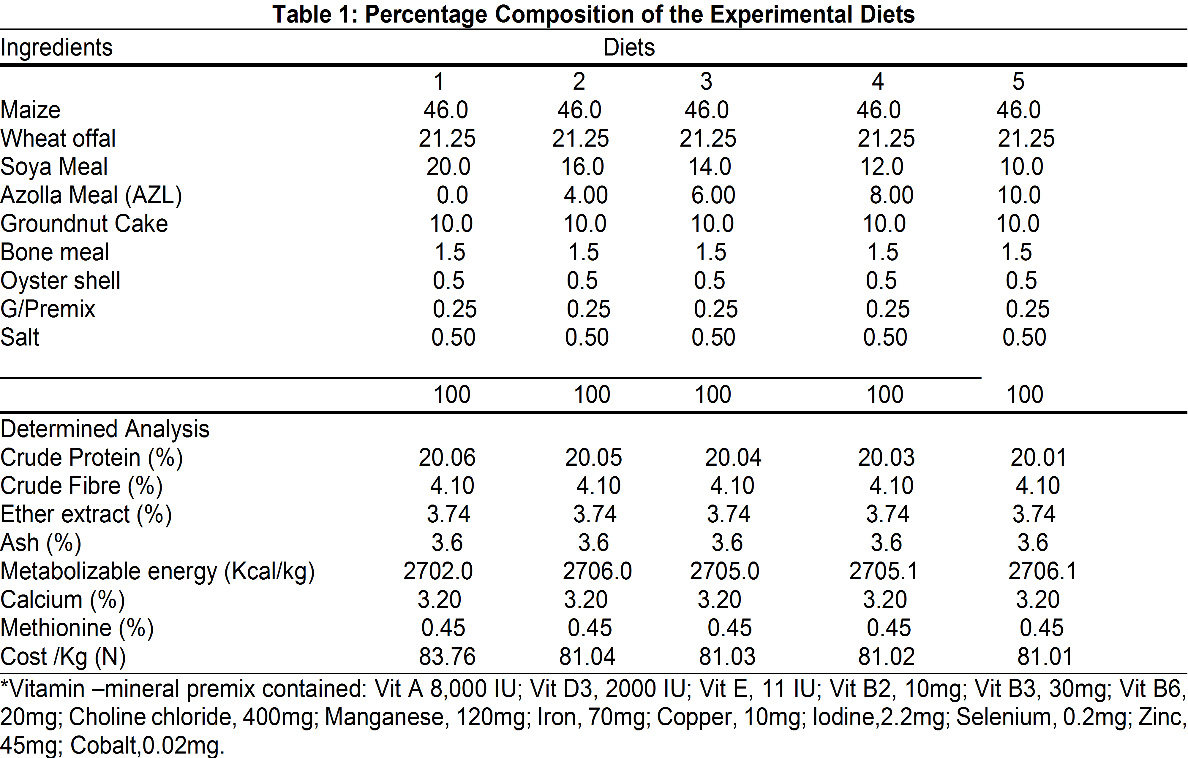 Table 1 reveals the percentage composition of the experimental diet. The crude protein ranges between 20.01-20.06%. The metabolizable energy values obtained are 2702.0, 2704.0, 2705.0, 2705.1 and 2706.1 (Kcal/kg) for diets 1, 2, 3, 4 and 5 respectively while those of cost per kg of feed are ₦83.76, ₦81.04, ₦81.03, ₦ 81.02 and ₦ 81.01 for diets 1, 2, 3, 4 and 5 respectively.