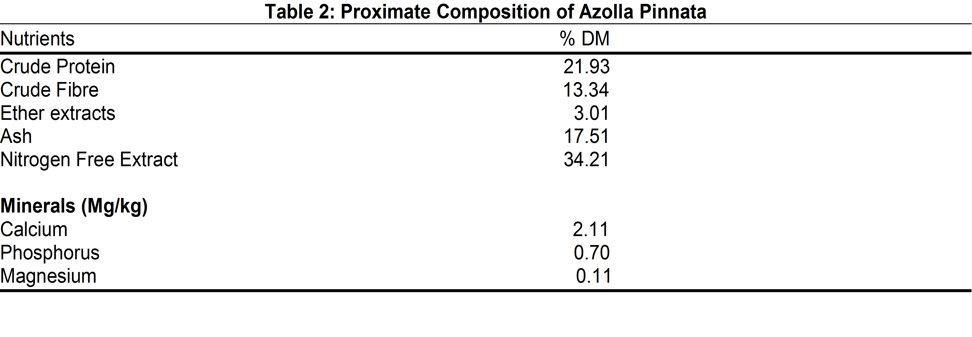 Table 2, shows the proximate composition of Azolla pinnata powder. The proximate components are 21.93%, 13.34%, 3.01%, 17.51%, 34.21%, 2.11, 0.70 and 0.11 (mg/kg) for crude protein, crude fibre, ether extract, ash, nitrogen free extract, calcium, phosphorus and magnesium for diets 1, 2, 3, 4 and 5 respectively.