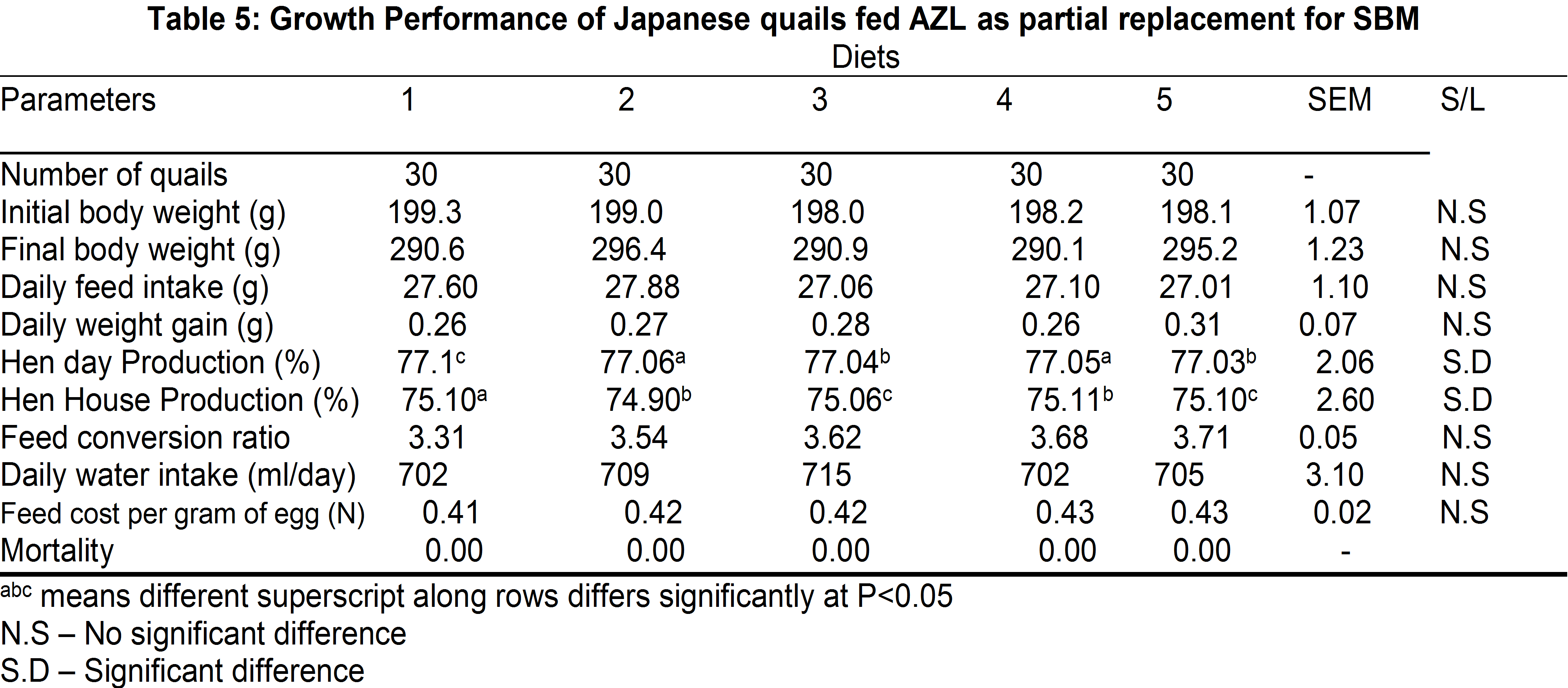 The growth performance values of quails fed AZL as a partial replacement for SBM are presented in Table 5, the final body weight ranges between 290.6 and 296.4g. The daily feed intake values obtained are 27.60, 27.88, 27.06, 27.10 and 27.01 g for diets 1, 2, 3, 4 and 5 respectively while those of daily weight gain are 0.26, 0.27, 0.28, 0.26 and 0.31g for diets 1, 2, 3, 4 and 5 respectively. The final weight, daily feed intake and daily weight gain were not significantly affected (P>0.05) by partial replacement for SBM with AZL. The feed intake values obtained are 27.60g, 27.88g, 27.06g, 27.10g and 27.01g for diets 1, 2, 3, 4 and 5 respectively. Hen day production values obtained are 77.1, 77.06, 77.04, 77.05 and 77.03 (%) for diets 1, 2, 3, 4 and 5 respectively while those of hen house production (%) are 75.10, 74.90, 75.06, 75.11 and 75.10 respectively. The daily feed intake, daily weight gain, feed conversion ratio, daily water intake and feed cost per gram of egg were not significantly (P>0.05) different among the dietary treatments although the daily water intake and feed cost per gram of egg increased from diet 1 to 3 and the values later declined. No mortalities were recorded among the treatment groups throughout the experimental period.