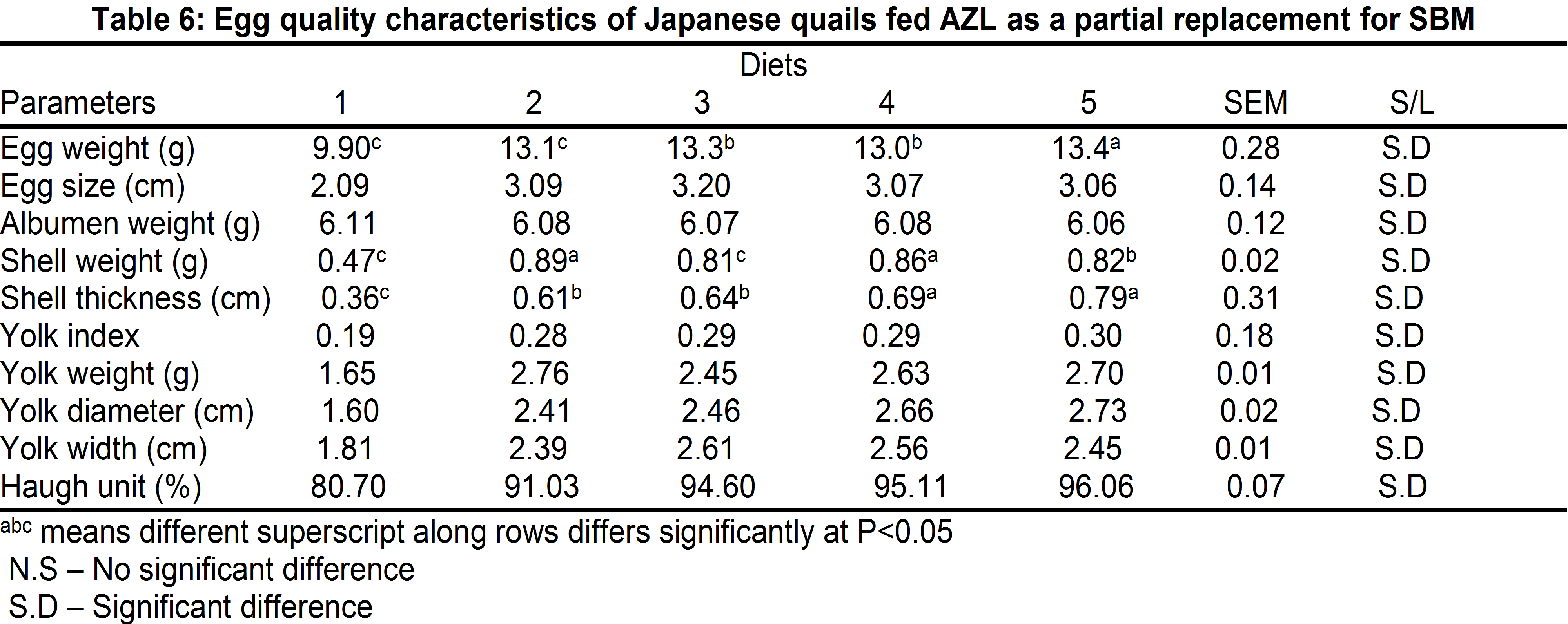 Table 6 shows the egg quality of Japanese quails fed AZL as a partial replacement for SBM. The egg weight values obtained are 9.90, 13.1, 13.3, 13.0 and 13.4 (g) for diets 1, 2, 3, 4 and 5 respectively while those of egg size (cm) are 2.09, 3.09, 3.20, 3.07 and 3.06 respectively. The albumen weight values obtained are 6.11, 6.08, 6.07, 6.08 and 6.06 (g) for diets 1, 2, 3, 4 and 5 respectively. The egg weight, egg size, albumen weight, yolk index, yolk weight, diameter and width values were significantly affected (P<0.05) by the partial replacement of SBM with AZL. Shell weight values are 0.47g, 0.89g, 0.81g, 0.86g and 0.82g for diets 1, 2, 3, 4 and 5 respectively while those of shell thickness values are 0.36, 0.61, 0.64, 0.69 and 0.79 (cm) for diets 1, 2, 3, 4 and 5 respectively. Shell weight and thickness were significantly (P<0.05) different among the dietary treatments. The Haugh unit values obtained are 80.70, 91.03, 94.60, 95.11 and 96.06 (%) for diets 1, 2, 3, 4 and 5 respectively.