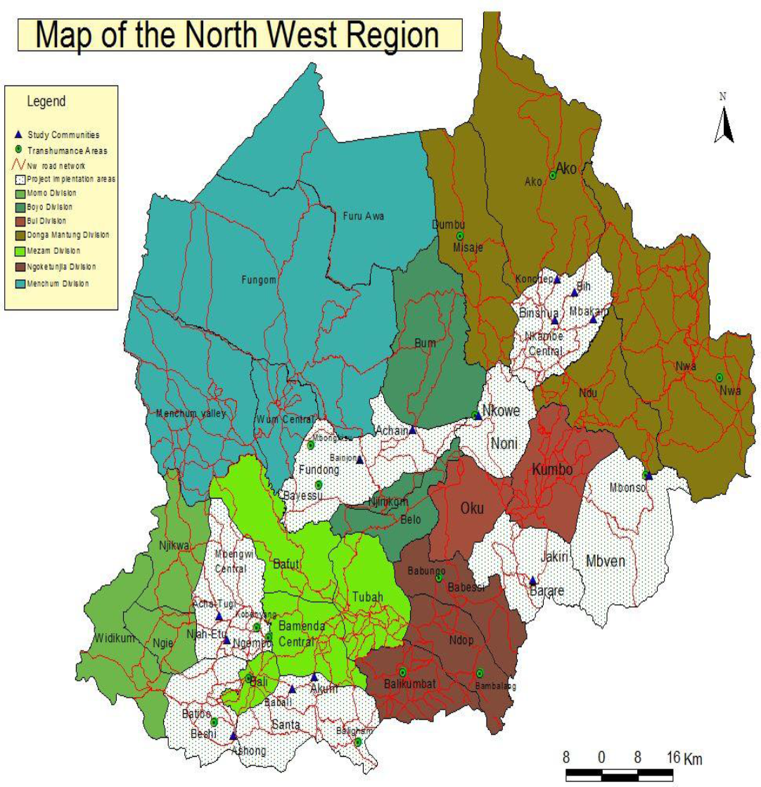 This study was conducted in the North West Region (NWR) that lies between latitudes 5° 45” and 9° 9”N longitudes 9 °13” and 11° 13”E. It covers an area of about 17400 km² and is bordered to the North and West by the Republic of Nigeria, to the South by the West and South West Regions and to the East by the Adamawa Region. Administratively, the North West Region is divided into seven Divisions namely: Boyo, Bui, Donga Mantung, Menchum, Mezam, Momo and Ngoketunjia (NIS, 2014). The topography of the Region varies greatly from depressions lower than 400m to high mountains 3000m above sea level and classified into three main zones: the lower altitude (<900 m); the mid altitude (900-1500 m) and the high altitude (˃1500 m). The high mountainous areas are cold (<15 °C) such as Ndu and Nkambe whereas the low altitude zones are hot (average 27 °C) such as the Ndop plain and Ako Sub Division. There are two distinct seasons: rainy season (mid-March to mid-October) and dry season (mid-October to mid-March). Annual rainfall varies from 1,300mm in the Ndop plain to over 3,000mm in Awing and Oku. The vegetation depends on the prevailing climate, altitude, soil conditions and human activities on the environment. The Region falls within the typical savannah zone covered predominantly with grass but around plains such as the Mbembe, Fura Awa and Widikum areas, the vegetation is predominantly forest. The climate, topography and vegetation make the North West Region an excellent Region for animal husbandry. The extensive, semi-intensive and intensive systems of animal husbandry practice at various scales in the Region involve large ruminants (cattle), small ruminants (goats and sheep), pigs, poultry and non-conventional livestock. Cattle production is practiced in Donga Mantung, Menchum, Bui, Boyo, Momo and Mezam Division. This study was carried out in five of the six cattle rearing divisions of the NWR (Figure 1). There are several transhumance communities across all these divisions. For instance, the Ndop plain in Ngoketunjia Division serves as an important transhumance zone for the cattle population from neighboring Divisions and the West Region (Manu et al., 2014).