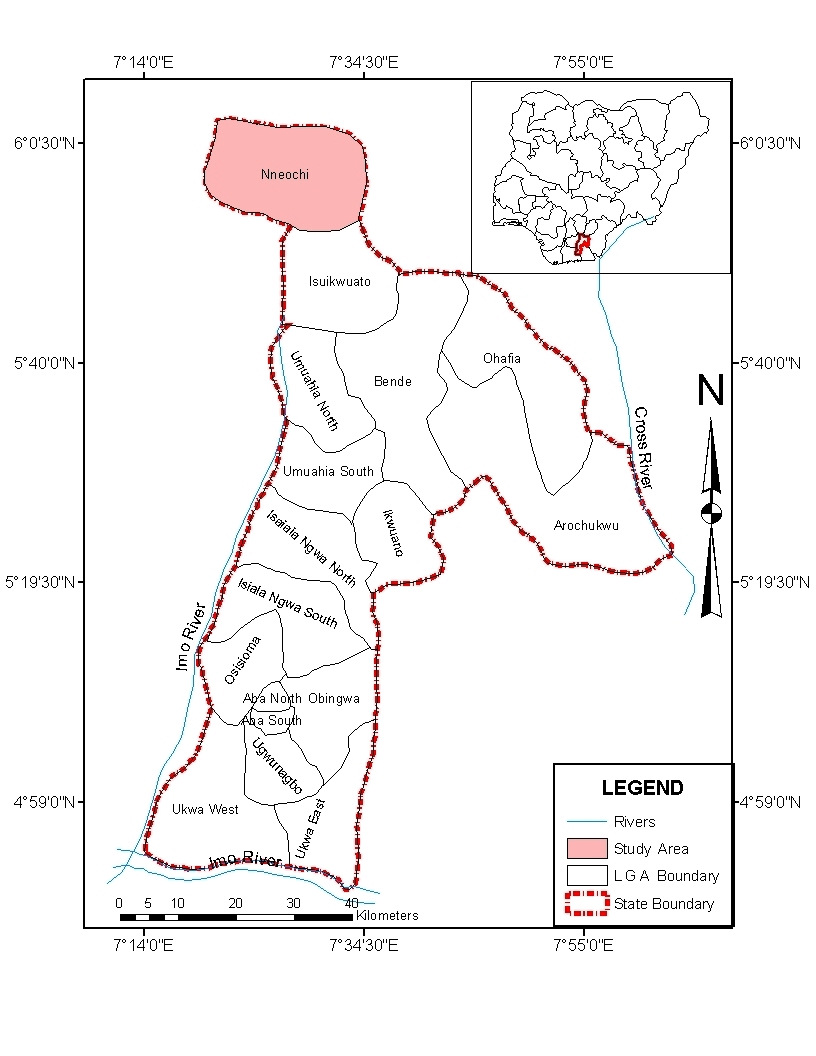 The study was carried out in Nneochi Local Government Area of Abia State. Abia State occupies 584sqkm. It is bounded on the north and northwest by Anambra, Enugu and Ebonyi States. To the west is Imo State, and the east and south-east are Cross- Rivers and Akwa Ibom States; to the south is Rivers State. It has an annual rainfall of 2400mm. The area is characterized by tropical wet climate usually from the month of March to October and dry climate usually from November to March. The most important Rivers in Abia State are the Imo and Aba Rivers which flow into the Atlantic Ocean through the Niger Delta (www.abiastate-ng.com). Abia State has seventeen (17) Local Government Areas (LGAs) of which Nneochi Local Government Area is one. The population of Nneochi L.G.A. is 163, 928 (as at the 2006 Census) and the major occupation of the people are trading and farming. Figure 1 is the Map of Abia State showing the study area.