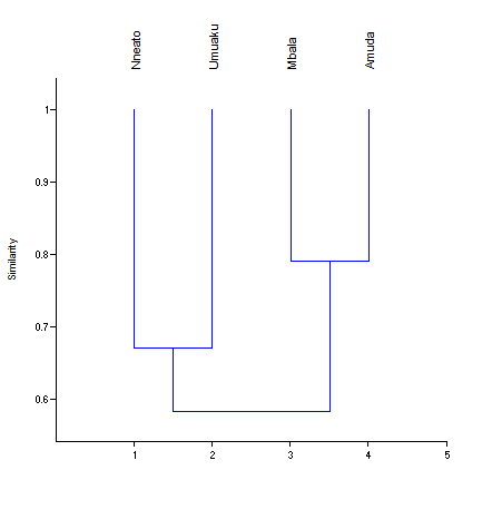 Table 5 shows the level of similarity in ante-natal and post-natal medicinal plant species between communities. The highest similarity was observed between Amuda & Mbala; followed by Amuda & Umuaku and Nneato & Umuaku; Mbala & Umuaku; Mbala & Nneato; and Amuda & Nneato, respectively. Figure 2 shows the hierarchical classification of the communities based on their similarities in medicinal plant species composition. Mbala and Amuda showed a closer association on one hand while Umuaku and Nneato showed a closer association on the other hand.