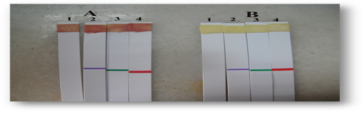 Figure 2: Detection of β-lactemase types using easy strips test. A-1:positive result for primary screening test of E.coli no. 10. A-2: positive result for ESβLs of A. baumannii no.10. A-3: positive result for MβL of A. baumannii no.10. A-4: positive result for AmpC of A. baumannii no.10. B 1-4: negative result for all above tests of the standard strain E. coli ATCC 25922