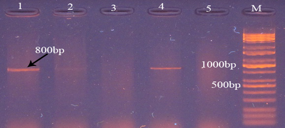 Figure 3: Gel electrophoresis (1% agarose, 7 V/cm for 90 min) for bla TEM gene for some A. baumannii isolates. Line M 100bp DNA ladder, lines (1, 4) positive results with 800bp amplicon
