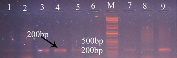 Figure 4: Gel electrophoresis (1% agarose, 7 V/cm for 90 min) for bla SHV gene for some A. baumannii isolates. line M 100bp DNA ladder, lines (1,2,3,4,5,7,8,9) positive results with 200bp amplicon