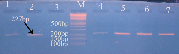 Figure 6: Gel electrophoresis (1% agarose, 7 V/cm for 90 min) for aa(c) 3′ gene for some A. baumannii isolates. Line M 100bp DNA ladder, lines (1, 2, 4 ,5,6,7) positive results with 227 bp amplicon
